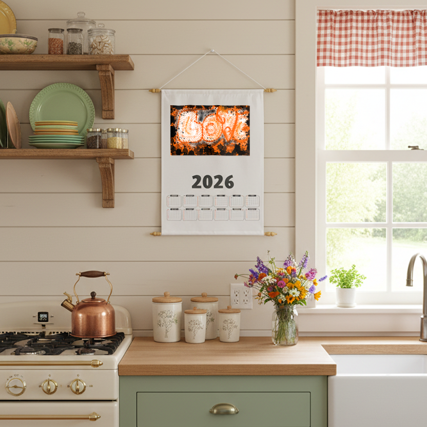 Calendario Bianco in poliestere con astine in legno e cordoncino. Dimensione 35x50 cm circa.